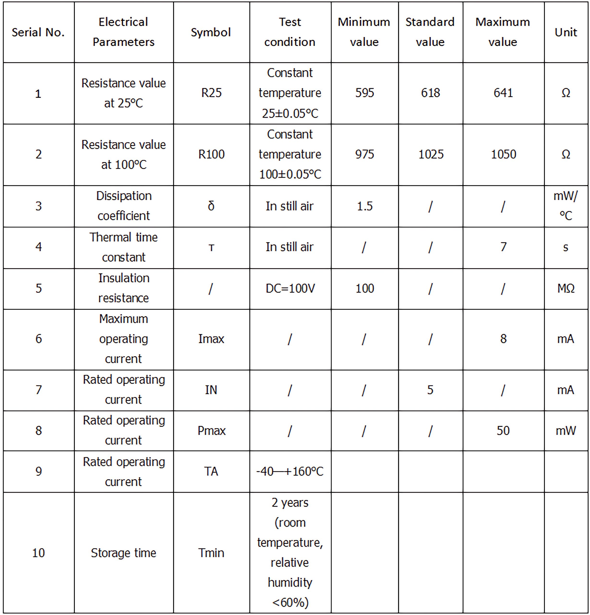 | Nominal resistance (zero power resistance at 25°C) | 577Ω~627Ω |